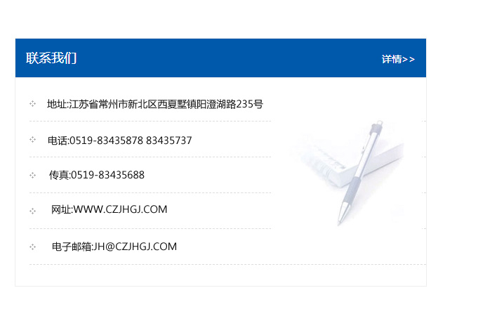 傳真:0519-83435688    郵編:213135    網址:WWW.czjhgj_com.blamp360.com    電子郵箱:JH@czjhgj_com.blamp360.com